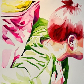 Aline Regese widmet sich in ihren farbintensiven, figurativen Aquarellen der Erforschung zwischenmenschlicher Beziehungen, Nähe und Emotion. Ihr Werk kreist um das, was Menschen verbindet, sichtbar gemacht durch verschlungene Körper, angedeutete Gesten und spannungsvoll komponierte Ausschnitte. Dabei setzt sie bewusst das Weiß des Papiers als aktives Element ein, das in Kontrast zu den farbigen Figurationen tritt und Zwischenräume sichtbar macht.In der Serie „Ausschnitte von Miteinander“ erforscht Regese die Komplexität des Miteinanders in fragmentarischen Ansichten. Ihre Arbeiten erzählen von flüchtigen Momenten der Intimität und wirken wie Momentaufnahmen – wie ein Blick durch ein Schlüsselloch auf etwas zutiefst Menschliches. Die Transparenz des Mediums und die intensive Farbigkeit verleihen den Werken eine besondere emotionale Tiefe. Verletzlichkeit und Kraft, Distanz und Nähe, Regeses Arbeiten eröffnen einen poetischen Raum, in dem das Unsichtbare zwischen Menschen sichtbar wird.