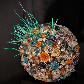 Ich liebe die Arbeit mit gebrauchten Aluminium-Kaffee-Kapseln, sie sind so farbenfroh, leicht zu schneiden und formen, haltbar auch im Außenbereich - aber sie sind ein Frevel unserer aktuellen Konsumgesellschaft. Mit der "verkapselten Welt" und dem "Kapselbaum" parodiere ich eine mögliche Zukunftsvision, wenn der Wolf im Kapselschafspelz Erfolg hat.