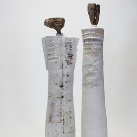 Die Gefäße und Skulpturen der Künstlerin sind inspiriert von Strukturen aus der Natur. Abdrücke von Hölzern, Steinen und Fasern werden in den weichen Ton gedrückt und verformt. Daraus entstehen Gefäße und Skulpturen, die gegebenenfalls ein Schwemmholz als Kopf oder Griff erhalten. In der Reduziertheit der Farbe kommt die Struktur klar zum Ausdruck.